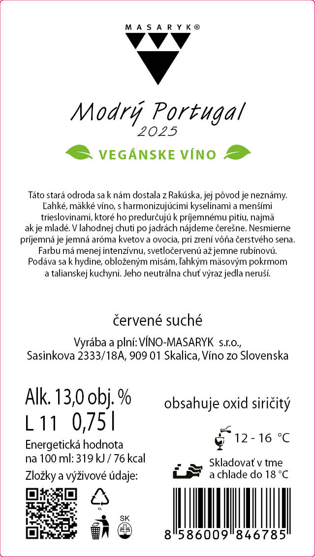 Táto stará odroda sa k nám dostala z Rakúska, jej pôvod je ale neznámy. Poznáme ho aj ako ako Portugalské modré, Portugal, Oportó. V 60.-rokoch takmer zmizla z našich viníc, no dnes sa opäť dostáva do popredia. Ľahké, mäkké víno, s harmonizujúcimi kyselinami a menšími trieslovinami, ktoré ho predurčujú k príjemnému pitiu, najmä ak je mladé. V lahodnej chuti po jadrách nájdeme čerešne, nesmierne príjemná je jemná aróma kvetov a ovocia, pri zrení vôňa čerstvého sena. Farbu má menej intenzívnu, svetločervenú až jemne rubínovú. Podáva sa k hydine, obloženým misám, ľahkým mäsovým pokrmom a talianskej kuchyni. Jeho neutrálna chuť výraz jedla neruší. Podávame pri teplote 12-16°C.